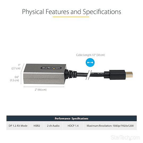 CABLE EXTRA LARGO: Adaptador Mini DisplayPort a HDMI con cable integrado de 30cm para reducir así la tirantez sobre el puerto/conector, en el caso de dispositivos 2 en 1, o portátiles colocados en soportes elevadores | Diseño compacto