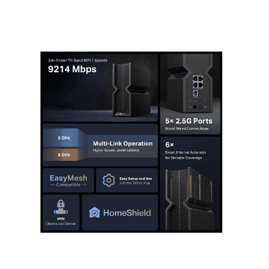 | Funciones avanzadas | • Operación multienlace (MLO) • Canal de 320 MHz • 4K-QAM • Multi-RU • Compatible con EasyMesh • Funciona con Alexa y Google Assistant • Red IoT |